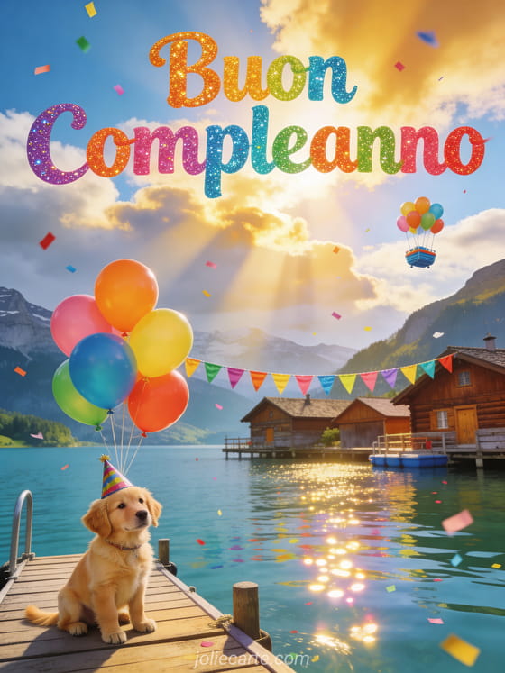 Festeggia un compleanno con questo colorato biglietto che mostra un adorabile cucciolo di golden retriever con cappellino da festa, seduto su un pontile presso un lago alpino svizzero con chalet in legno, palloncini colorati nel cielo, festoni e coriandoli. Scopri anche un biglietto di compleanno con rose e farfalla o un biglietto di compleanno fiabesco.
