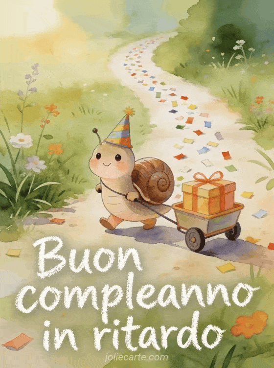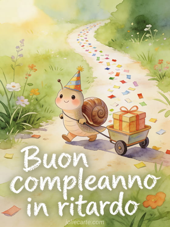 Meglio tardi che mai! Invia questo adorabile biglietto di compleanno in ritardo con una lumachina con cappellino da festa che trascina un carrettino con un regalo, lasciandosi dietro un sentiero di coriandoli. Un'illustrazione ad acquerello piena di charme e umorismo. Scopri anche un buon compleanno in ritardo gif o buon compleanno in ritardo umorismo.