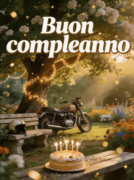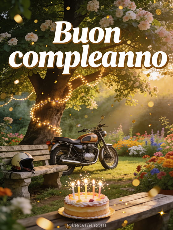 Condividi questo incantevole biglietto di compleanno per l'appassionato di moto, con una moto vintage in un giardino fiorito. Scopri anche un gif buon compleanno uomo divertente o un bel biglietto compleanno uomo animato gratis.