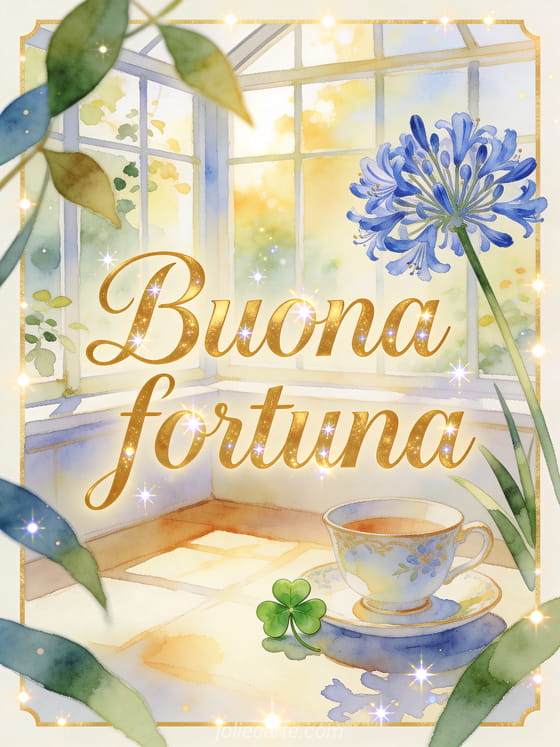 Invia buona fortuna con scrittura dorata, una tazza in porcellana, un piccolo portafortuna verde e fiori blu di agapanto in una veranda soleggiata. Scopri anche biglietto di buona fortuna, buona fortuna per il tuo esame testo o buona fortuna gif animate gratis.