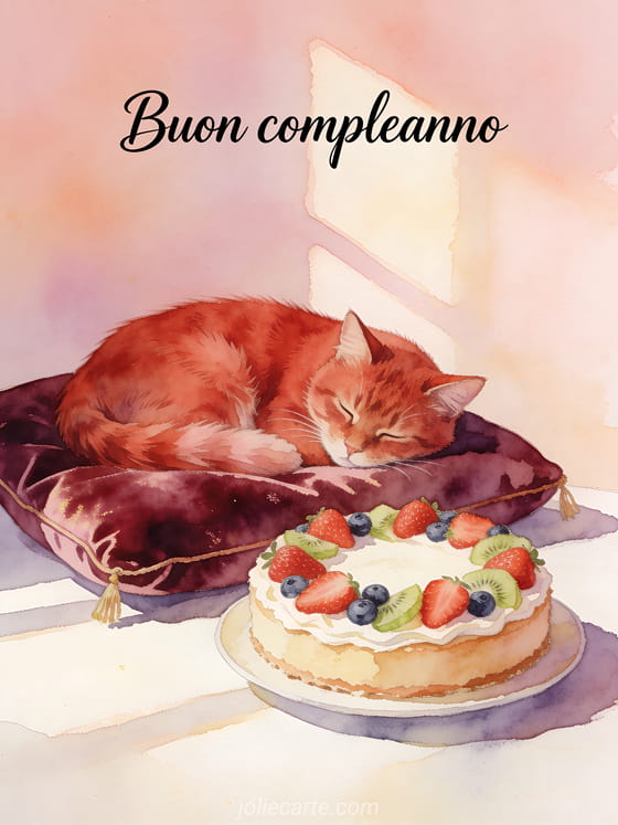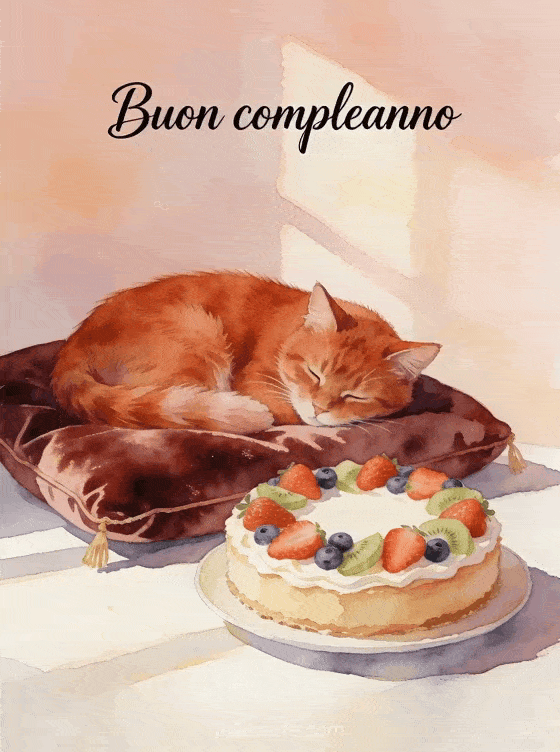 Invia questo incantevole biglietto di compleanno animato gratis con un gatto rosso addormentato su un cuscino di velluto e una torta decorata con frutta. Scopri anche un buon compleanno gif fuochi d'artificio animato o un buon compleanno gif animato.