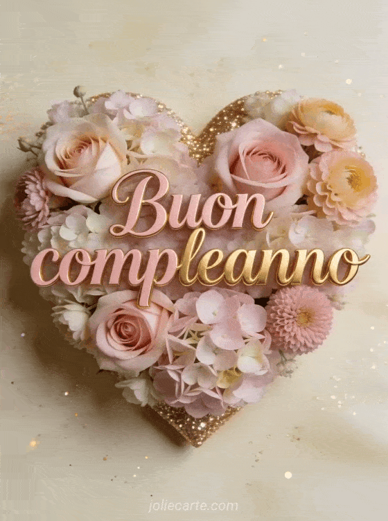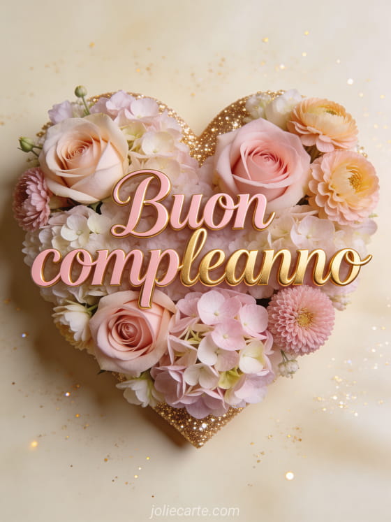 Condividi un saluto delicato di compleanno con scritte rosa e oro, un arrangemento floreale a forma di cuore con rose, ortensie e ranuncoli, su uno sfondo crema con scintille dorate. Puoi inviare anche un biglietto di biglietto di compleanno donna gratis e animato, un biglietto di compleanno donna natura o una carta compleanno donna bouquet di fiori.
