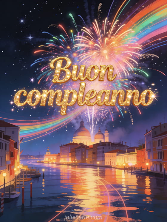 Festeggia un compleanno spettacolare con questo biglietto mozzafiato con fuochi d'artificio colorati sopra una città illuminata di notte. Scopri anche un biglietto compleanno con paesaggio di montagna o un biglietto compleanno goditi ogni momento o un biglietto compleanno solo felicità.