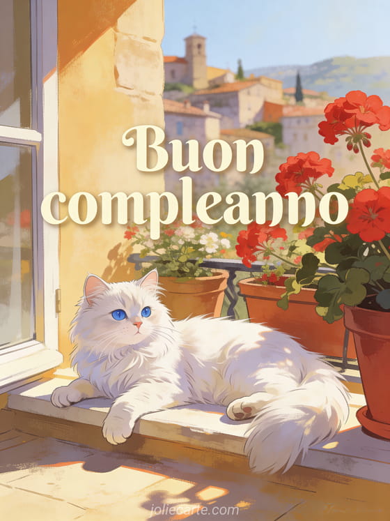Invia questo delizioso biglietto animato di compleanno con un gatto persiano bianco dagli occhi azzurri su un davanzale soleggiato con vasi di fiori e gerani rossi, con un villaggio provenzale sfocato sullo sfondo. Una cartolina gratuita con fascino mediterráneo. Scopri anche compleanno gif animato o biglietto di compleanno animato gratis.