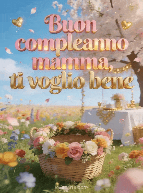 Di' alla mamma che le vuoi bene con lettere rosa e oro, un campo luminoso di fiori selvatici, una corona di fiori su un cesto di vimini, una tavola sotto un albero in fiore, petali nel vento e cuori dorati. Puoi inviare anche buon compleanno mamma immagini, un buon compleanno mamma biglietto animato o un buon compleanno mamma gif.