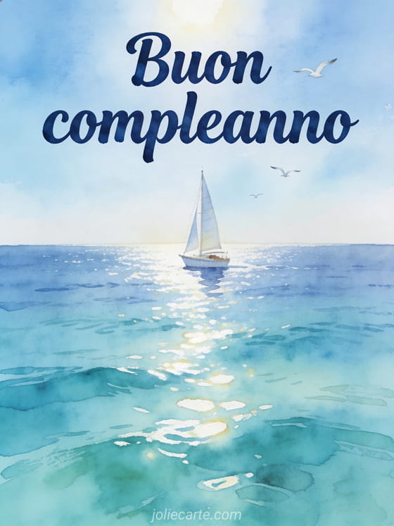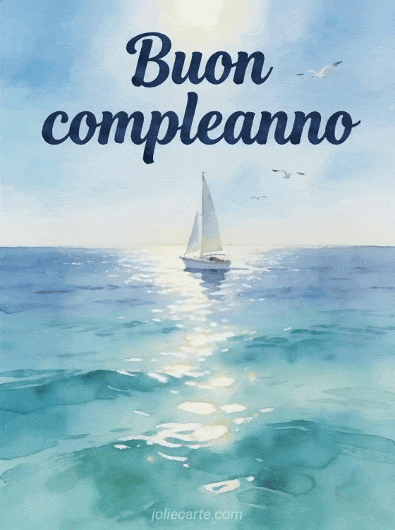 Condividi un tranquillo biglietto marino di compleanno con una barca a vela sull'acqua turchese, riflessi del sole e gabbiani sotto un cielo limpido. Scopri anche un compleanno figlio, un buon compleanno figlio mio o un buon compleanno divertente figlio mio.