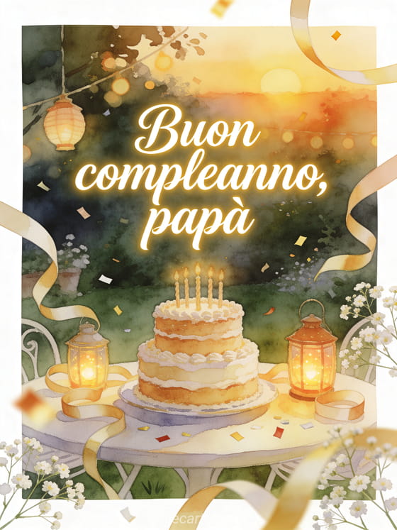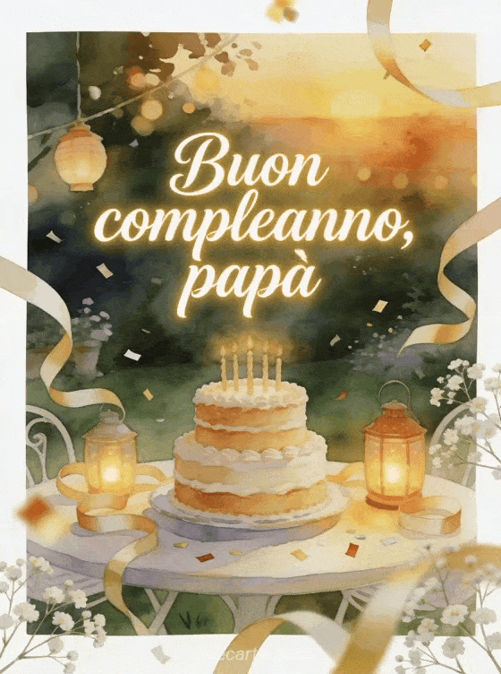 Condividi un biglietto di compleanno per papĂ con una torta a piani su un tavolo da giardino, circondata da nastri arricciati e lanterne luminose. Puoi scegliere anche poesia poesia papĂ buon compleanno, poesia di compleanno papĂ per bambino o poesia di compleanno per papĂ .