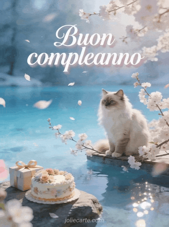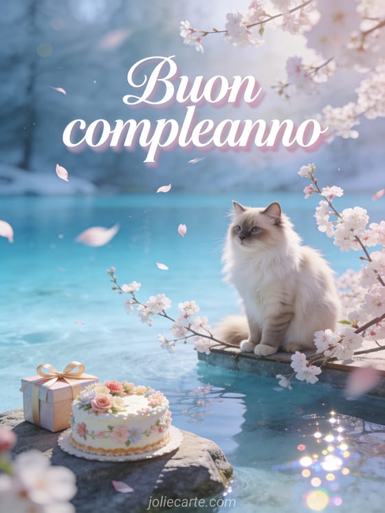 Invia un tenero biglietto di compleanno con un gatto angora turco accanto a un lago glaciale azzurro latte, fiori di ciliegio, una torta decorata con fiori e un regalo incartato. Puoi condividere anche un fratellino buon compleanno mio fratello gif, un buon compleanno fratellino gif o un buon compleanno fratellino.