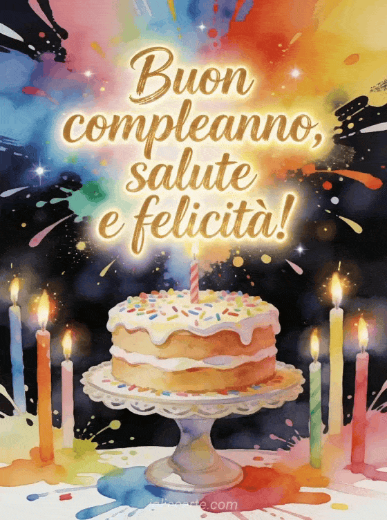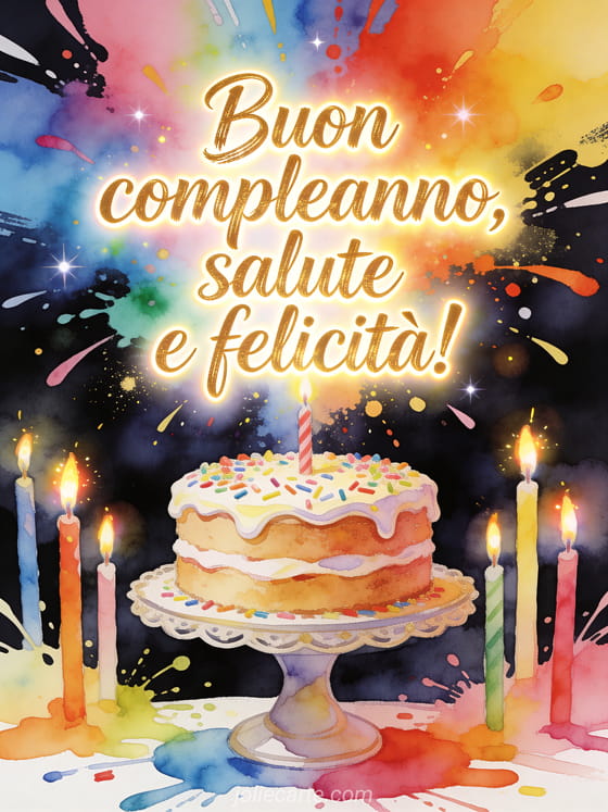 Auguragli salute e felicità con un vivace biglietto di compleanno in acquerello digitale con scritte dorate a pennello, schizzi luminosi di colore, candeline di compleanno, una torta decorata e scintillio festivo. Puoi inviare anche un biglietto di biglietto di compleanno uomo gratis facebook, un biglietto di biglietto di compleanno uomo auto o un biglietto di battuta compleanno uomo.