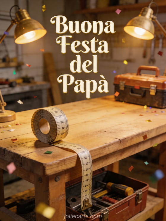 Invia un biglietto facile per la Festa del PapĂ con semplice scritta color crema, banco in legno pulito, cassetta degli attrezzi lucida, metro pieghevole, lampade calde da officina e ordinati accenti di coriandoli. Scopri anche un modello di biglietto festa del papĂ , buona festa del papĂ a mio figlio o immagini gratuite per la Festa del PapĂ .