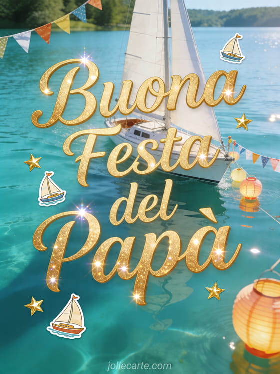 Invia un biglietto felice Festa del Papà con elegante scritta dorata, piccoli adesivi di barche a vela e stelle dorate, una barca a vela bianca che scivola su un lago turchese vicino a festoni e lanterne galleggianti nella luce brillante d'estate. Scopri anche un modello di biglietto per la Festa del Papà, una foto festa del papà o un'immagine di festa del papà.