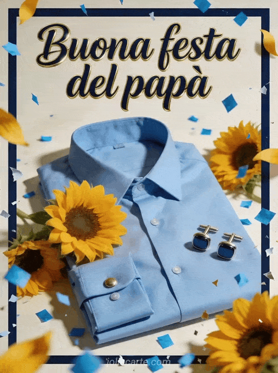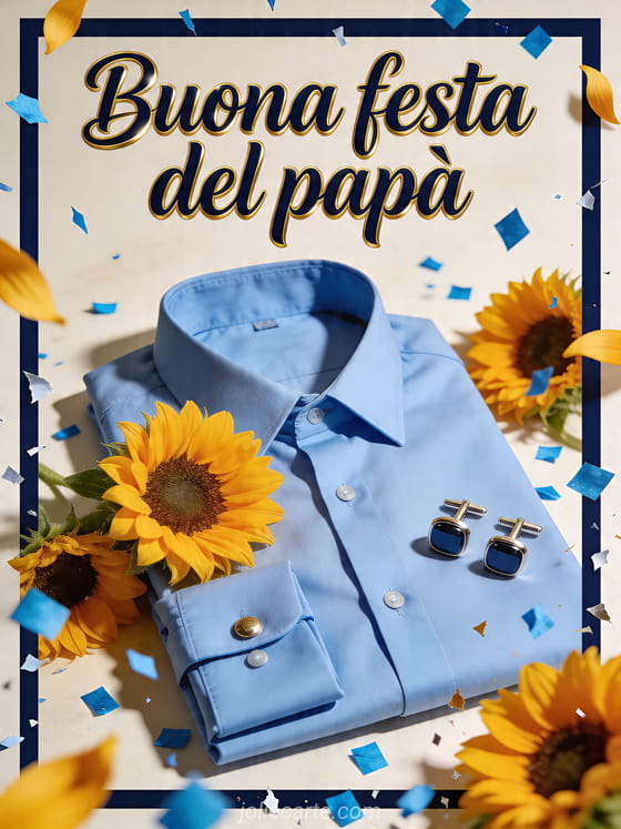 Invia un biglietto elegante per la festa del papĂ con camicia, una camicia azzurro cielo piegata fotorealistica, gemelli lucidi, girasoli e coriandoli blu nitidi in una luce calorosa da studio. Scopri anche un biglietto originale per la Festa del PapĂ , buona festa papĂ o biglietti festa del papĂ .