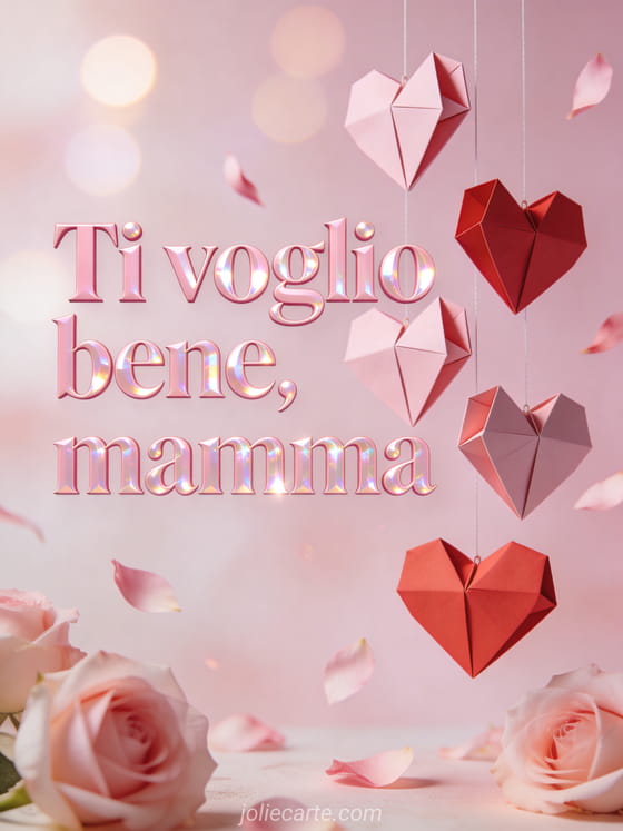 Esprimi il tuo amore con questo biglietto festa della mamma gratis con cuori origami e petali di rosa. Scopri anche buona festa della mamma figlia mia o biglietto virtuale festa della mamma gratuito.