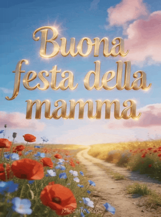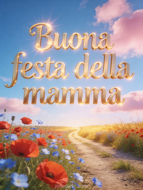 Condividi questo luminoso biglietto per la festa della mamma. Un sentiero di campagna bordato di papaveri e fiordalisi che porta a un orizzonte dorato sotto un cielo azzurro con nuvole rosa. Scopri anche un buona festa della mamma mamma biglietto o una immagine gratis festa della mamma.