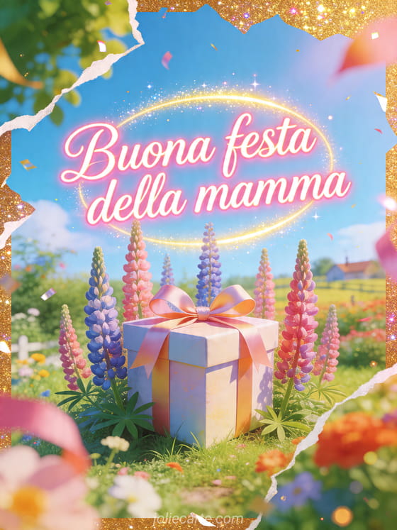 Condividi un biglietto festa della mamma con una scatola regalo con nastro, alti lupini, colori vivaci di primavera e dettagli che superano il bordo. Scopri anche immagini gratuite festa della mamma, festa della mamma testo o biglietto con cuore festa della mamma.