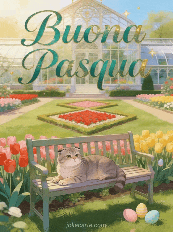 Festeggia la Pasqua con questo incantevole biglietto animato gratuito con un gatto Scottish Fold su una panchina da giardino con vista sulle aiuole geometriche di tulipani di Keukenhof con una serra vittoriana e uova di Pasqua pastello. Scopri anche carte gratuite de pâques cartes de joyeuses fetes de paques.