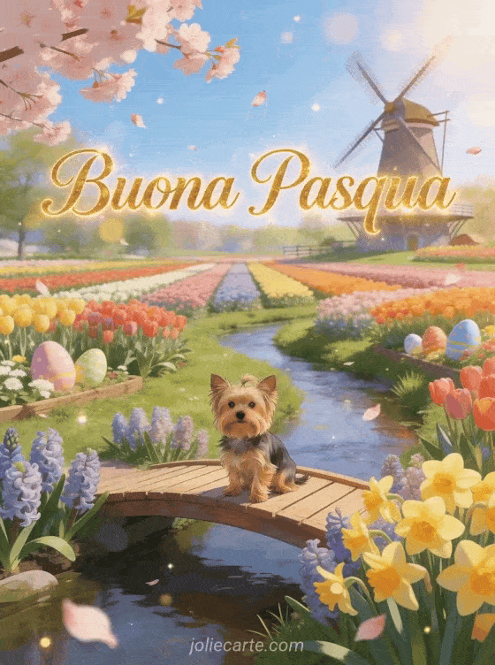 Festeggia la Pasqua con questo incantevole biglietto animato gratuito con uno Yorkshire Terrier su un ponte di legno sopra un ruscello con giacinti e narcisi a Keukenhof con tulipani multicolori, un mulino olandese e petali di ciliegio. Scopri anche cartes de joyeuses fetes de paques texte carte de voeux pâques.