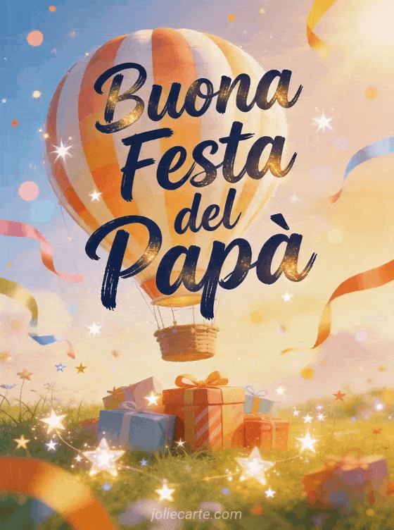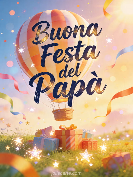 Invia un biglietto originale per la Festa del PapĂ con grandi lettere a pennello blu navy, bagliore dorato, una mongolfiera a righe sopra un prato luminoso, regali, luci di stelle e nastri colorati. Scopri anche biglietti festa del papĂ , buona festa della mamma e buona festa del papĂ o buona festa papĂ testo.