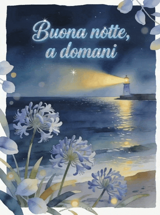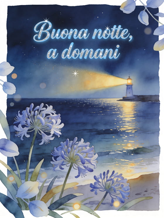 Dì buona notte e a domani con un faro ad acquerello che proietta un fascio caldo su un mare notturno calmo e fiori di agapanto in primo piano. Scopri anche una cartolina virtuale animata buonanotte, una cartolina animata buonanotte o un messaggio per augurare buonanotte.