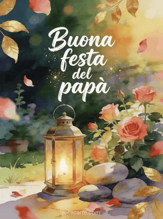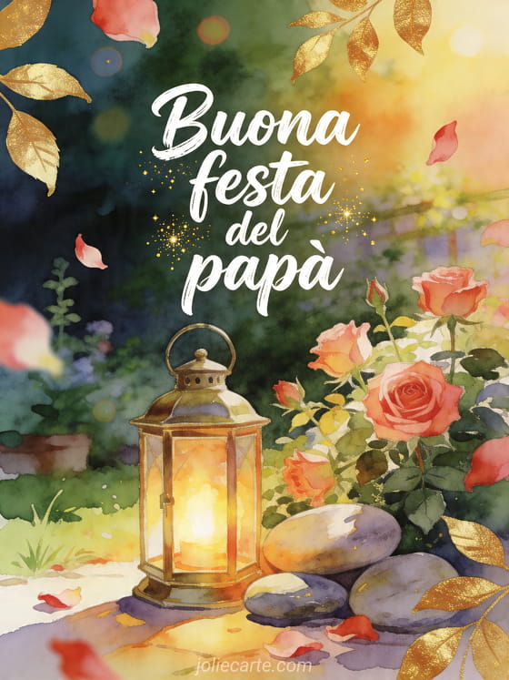 Invia un biglietto caloroso per la festa del papĂ con un'illustrazione ad acquerello dai colori intensi: una lanterna di ottone luminosa accanto a pietre lisce di fiume, rose e foglie dorate in un angolo soleggiato di giardino. Scopri anche poesia per la Festa del PapĂ il mio cuore mi dice, biglietti per la festa del papĂ o un biglietto gratuito festa del papĂ .