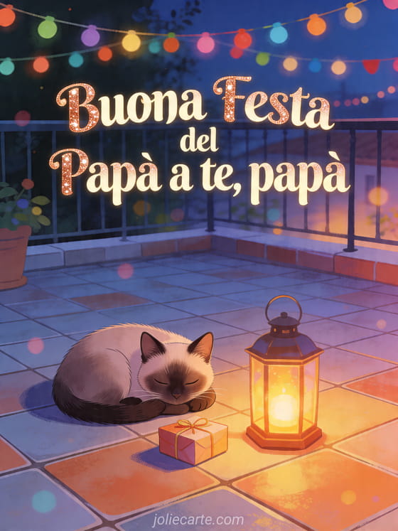 Invia a papĂ un biglietto illustrato e allegro con un gatto siamese accoccolato accanto a un piccolo regalo e a una lanterna luminosa su una terrazza piastrellata. I colori caldi della sera rendono questo augurio dolce e festoso. Scopri anche fiori festa del papĂ , amore mio buona Festa del PapĂ o una poesia d'amore per la Festa del PapĂ .