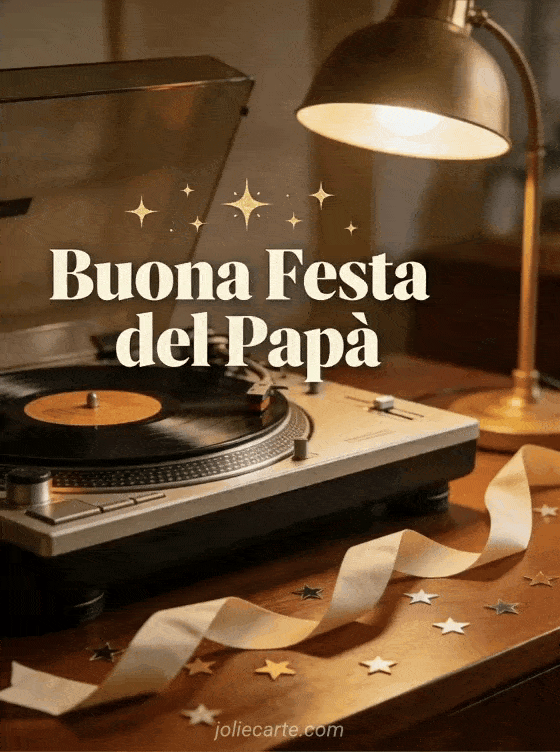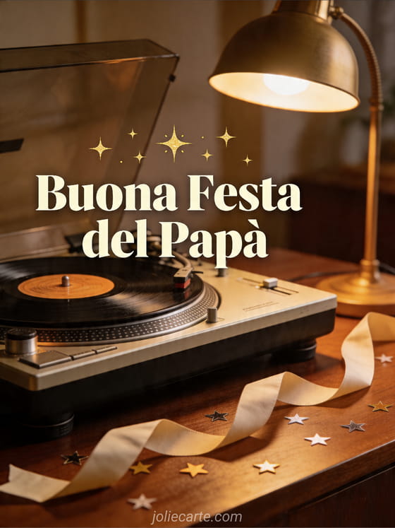 Condividi un biglietto accogliente per la Festa del PapĂ con giradischi vintage, disco in vinile, luce calda di lampada, nastro piegato e piccoli coriandoli a stella su un tavolo in noce. Questo design nostalgico Ăš perfetto per un papĂ che ama la musica. Scopri anche buona festa al papĂ , buona festa del papĂ a tutti i papĂ del mondo o una immagine buona Festa del PapĂ .