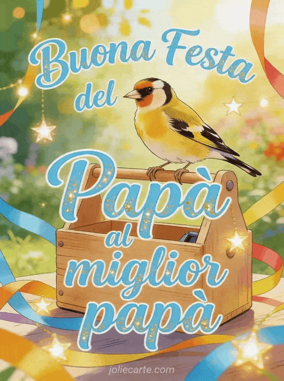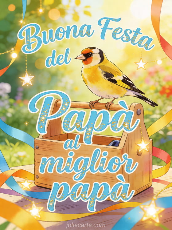 Festeggia il miglior papĂ con un biglietto illustrato e colorato che mostra un cardellino posato su una piccola cassetta degli attrezzi in legno, circondato da nastri luminosi e luci a stella in un giardino soleggiato. Ă allegro, sincero e facile da condividere. Scopri anche auguri festa del papĂ , citazione breve festa del papĂ o un biglietto buona festa papĂ .