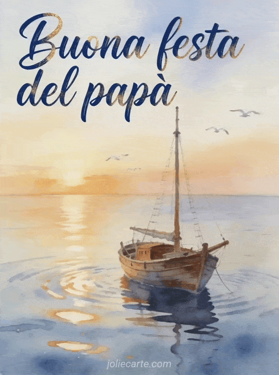 Invia un tenero biglietto per la festa del papà con un delicato veliero ad acquerello su un mare calmo al tramonto. Questo augurio gratuito porta un tocco sereno e affettuoso al giorno speciale di papà.