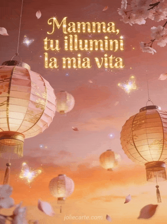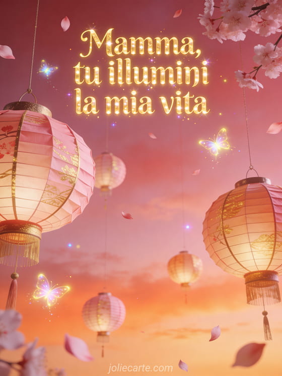 Festeggia la mamma con questo incantevole biglietto per la festa della mamma con lettere dorate luminose, lanterne fluttuanti e petali di ciliegio. Scopri anche bella cartolina festa della mamma o modello biglietto per festa della mamma.
