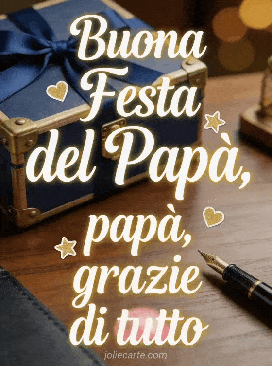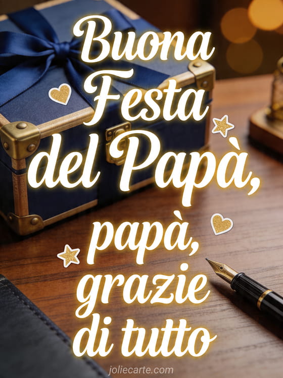 Invia un biglietto personalizzato Festa del Papà con scritta calligrafica color crema, piccoli adesivi di cuori e stelle, una scrivania in legno lucido, penna stilografica, scatola regalo sigillata, dettagli in ottone e nastro blu intenso. Scopri anche tanti auguri festa del papà, buona festa del papà a mio figlio o un modello di biglietto festa del papà.