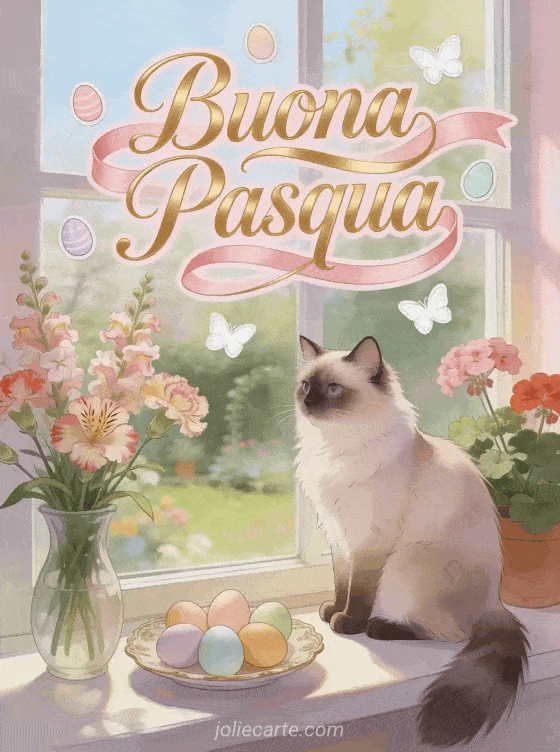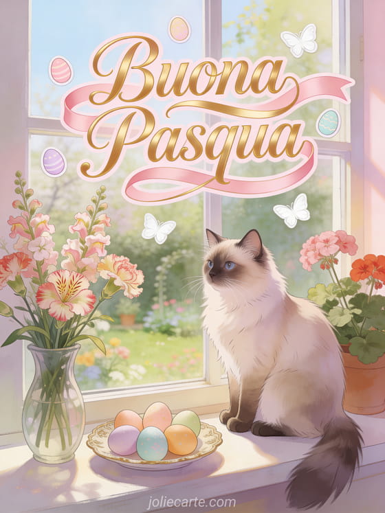 Invia questo incantevole biglietto virtuale di Pasqua con un gatto Birmano seduto sul davanzale accanto a un vaso di tagete e gerani, uova di Pasqua decorate su un piatto vintage e un giardino primaverile visibile dalla finestra. Scopri anche un biglietto di Pasqua, un biglietto di auguri pasquali o un biglietto di Pasqua gratuito.