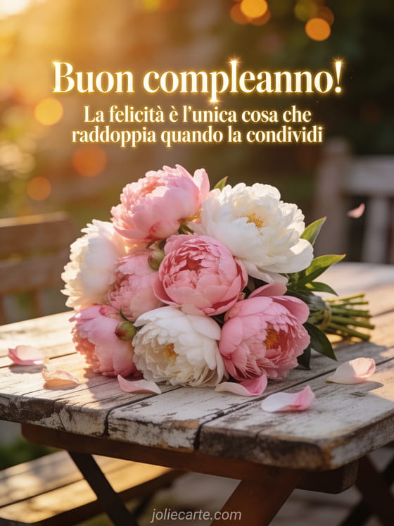 Invia un bellissimo breve messaggio di compleanno con un elegante bouquet di peonie. Scopri anche una cartolina parole di compleanno per un'amica o una cartolina parole gentili per il compleanno.