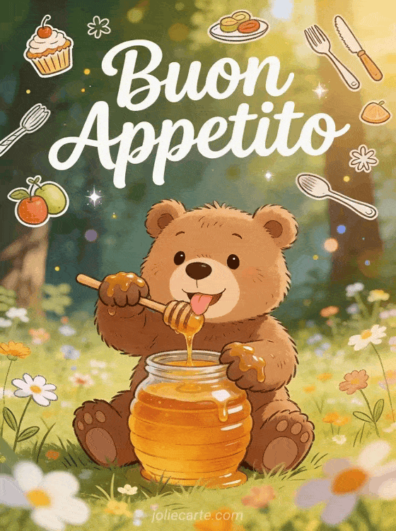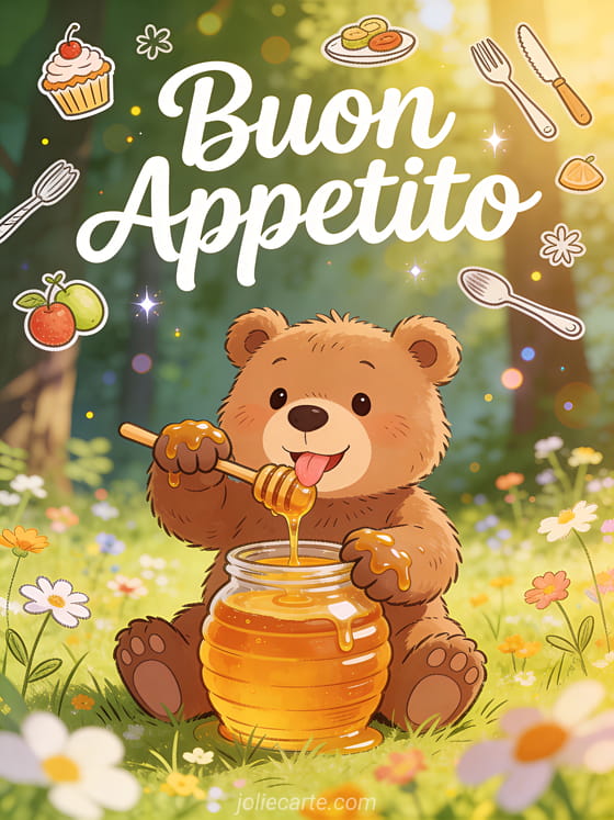 Invia questo adorabile disegno di buon appetito con un orsetto cartoon che lecca miele da un grande barattolo in un prato soleggiato. Scopri anche una cartolina buon appetito immagine o una cartolina umorismo divertente buon appetito.
