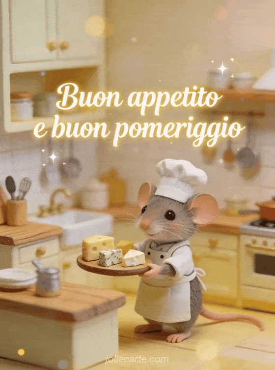 Condividi un augurio di buon appetito e buon pomeriggio con questa adorabile cartolina del topo cuoco. Scopri anche buon pomeriggio immagini animate o buon pomeriggio gif animato.