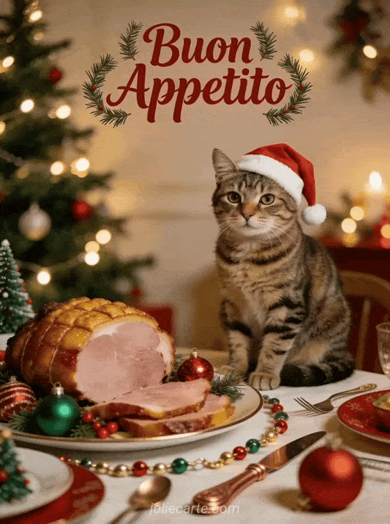 Invia questo accogliente buon appetito natalizio con un gatto tigrato realistico con cappello di Babbo Natale accanto a un pranzo festivo con prosciutto arrosto e decorazioni di agrifoglio. Scopri anche una cartolina buon appetito gif immagine o una cartolina buon appetito biglietto immagine.