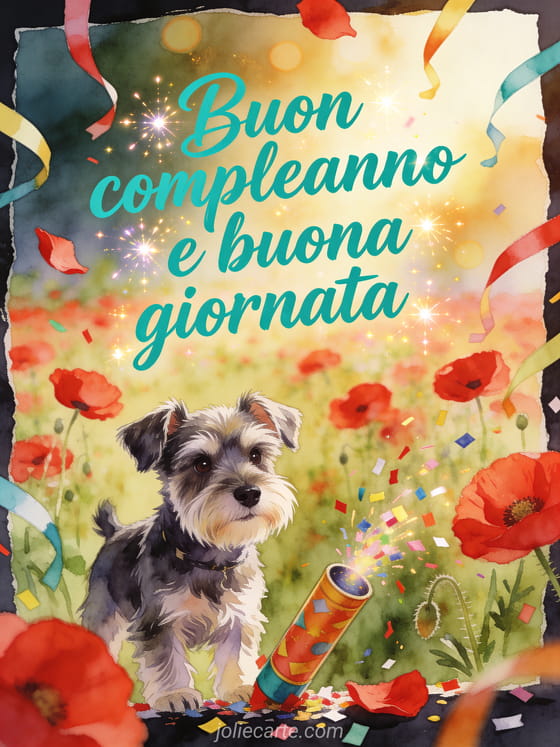 Festeggia tua nipote con un luminoso biglietto ad acquerello che mostra un cucciolo di schnauzer nano accanto a un cannone di coriandoli in un campo di papaveri rossi. Scopri anche un buon compleanno alla mia nipotina, un compleanno per mia nipote o un buon compleanno nipote immagine.