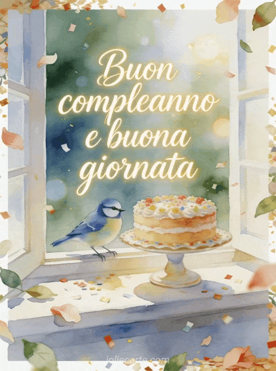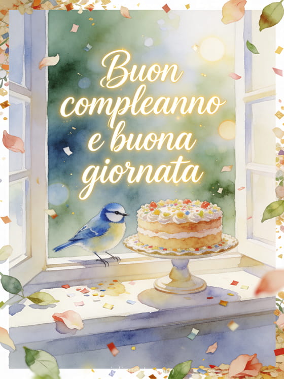 Invia un biglietto buon compleanno a papĂ con elegante calligrafia crema, una cinciarella posata accanto a un'alzata per torta decorata su un davanzale luminoso, petali, foglie e coriandoli oltre il bordo. Scopri anche buon compleanno mio papĂ , buon compleanno papĂ amore o una poesia buon compleanno suocero.