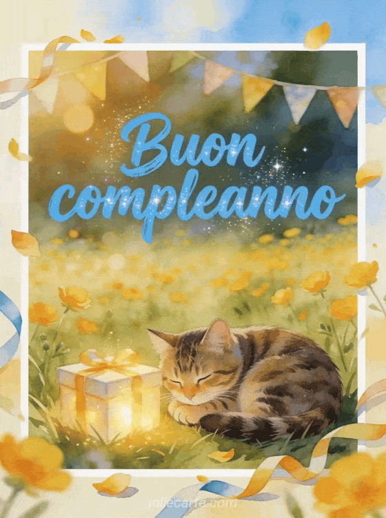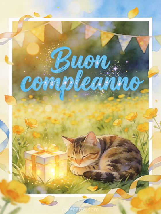 Invia alla tua nipotina un dolce biglietto di buon compleanno con un gatto tigrato accoccolato accanto a una scatola regalo luminosa in un prato allegro di ranuncoli. Potrebbe piacerti anche un compleanno per mia nipote o un buon compleanno nipote immagine per festeggiare con affetto.