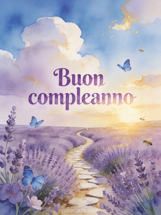 Condividi un augurio sereno di compleanno con lettere viola luminose ad acquerello, un campo di lavanda sotto un cielo blu, nuvole soffici, un sentiero sinuoso, farfalle blu, api e luce dorata del tramonto. Puoi inviare anche un buon compleanno a una mamma meravigliosa, un buon compleanno mamma animato o un buon compleanno mamma biglietto.