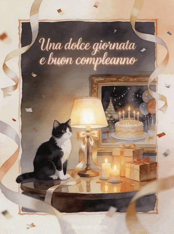 Invia un augurio elegante di compleanno con un gatto bianco e nero in acquerello, una lampada da scrivania illuminata, nastri di raso, regali e candeline di compleanno. Puoi condividere anche un messaggio di compleanno collega di lavoro, un buon compleanno da una collega di lavoro o un buon compleanno alla mia collega di lavoro.