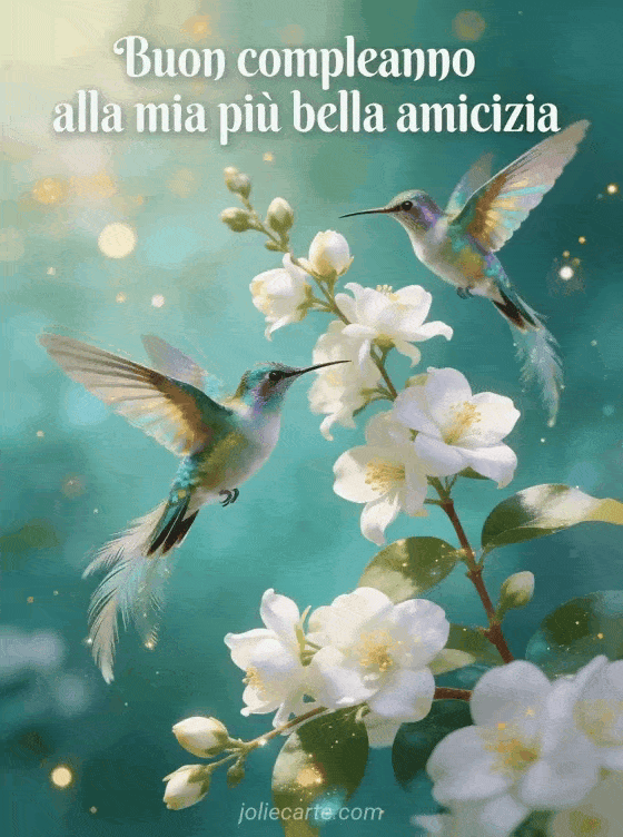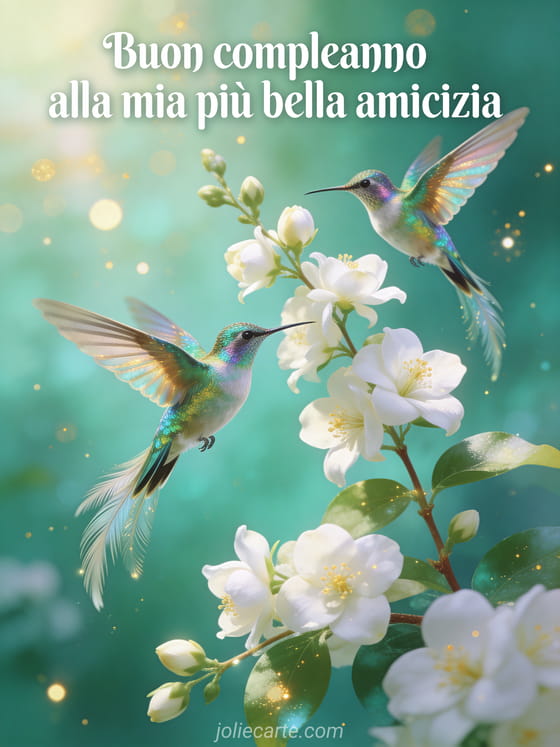 Invia un biglietto delicato con due colibrì iridescenti che volteggiano intorno a un ramo di gelsomino in fiore. Scopri anche un biglietto compleanno donna illustrato o gif animate compleanno donna.