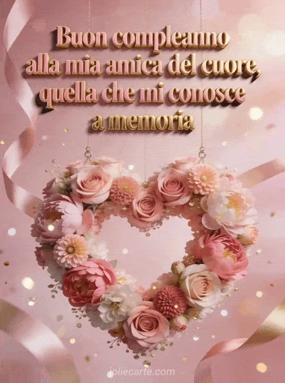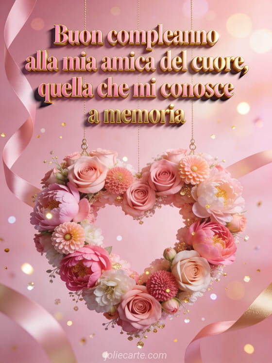 Festeggia un'amicizia dal cuore con scritte rosa e dorate, un cuore floreale sospeso fatto di rose rosa, peonie e ranuncoli, scintille dorate, nastri satinati e una morbida luce bokeh. Puoi inviare anche un biglietto di buon compleanno amicizia, un biglietto di buon compleanno amica divertente o un messaggio compleanno migliore amica.