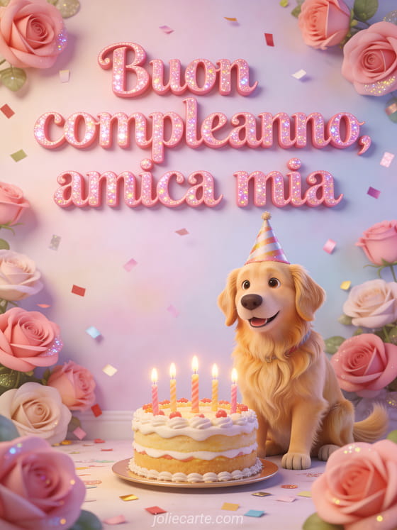 Fai sorridere la tua amica nel giorno del suo compleanno con questa deliziosa cartolina con un adorabile cane golden retriever con cappellino da festa, seduto di fronte a una torta decorata con candeline, circondato da coriandoli su sfondo pastello. Scopri anche buon compleanno amica come sorella o auguri compleanno amica.