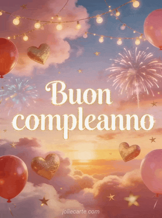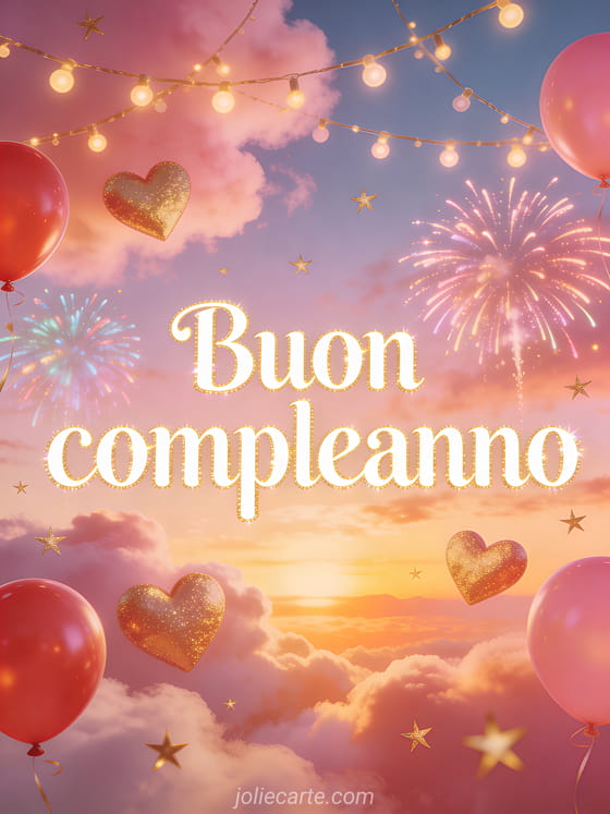 Invia un augurio di compleanno romantico con un cielo al tramonto pieno di nuvole rosa e dorate a forma di cuore. Fuochi d'artificio colorati, fili di luci, palloncini rossi e rosa e stelle dorate creano un'illustrazione festosa. Scopri anche buon compleanno vita mia, buon compleanno amore mio o buon compleanno tesoro mio.