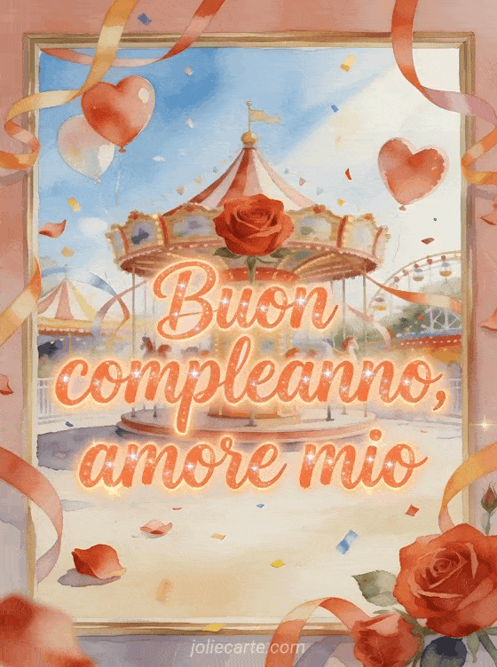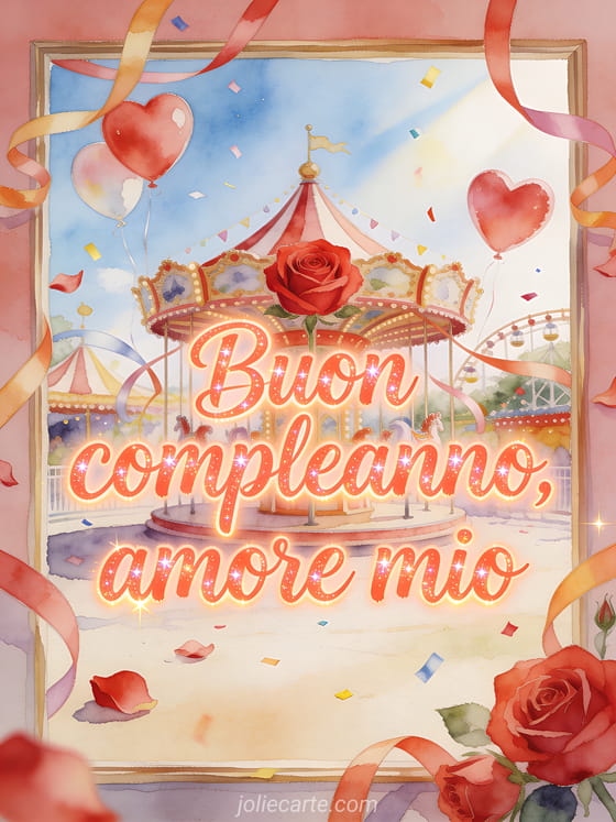 Augura un compleanno felice al tuo amore con un biglietto in acquerello che mostra una giostra di rose rosse, palloncini a cuore, coriandoli luminosi e nastri che attraversano la cornice. Personalizza questo saluto romantico online e invialo gratis in pochi istanti. Scopri anche un gif animato buon compleanno cuore mio, messaggi di compleanno per il mio amore o un biglietto animato buon compleanno amore mio.