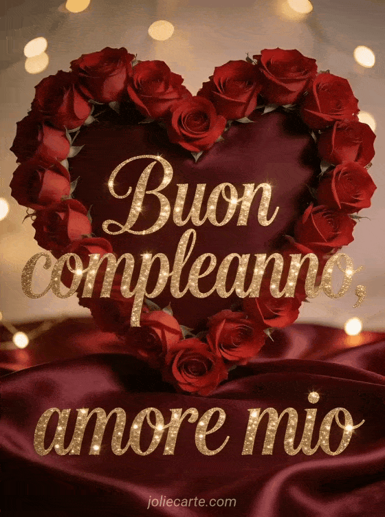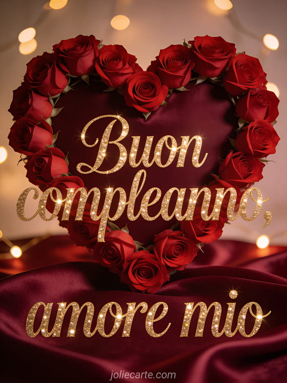 Invia un augurio di compleanno appassionato e romantico con rose rosse fotorealistiche disposte a forma di cuore su seta bordeaux. Luci calde sullo sfondo e scritte dorate creano un messaggio elegante per il tuo amore. Scopri anche buon compleanno tesoro mio, buon compleanno tesoro mio o compleanno romantico.