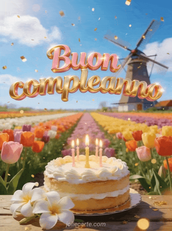 Festeggia un compleanno speciale con questo colorato biglietto che mostra campi infiniti di tulipani, fiori di tiaré, una torta decorata con candeline accese e una pioggia di glitter dorati. Scopri anche un biglietto di buon compleanno o un immagine gratis di buon compleanno.
