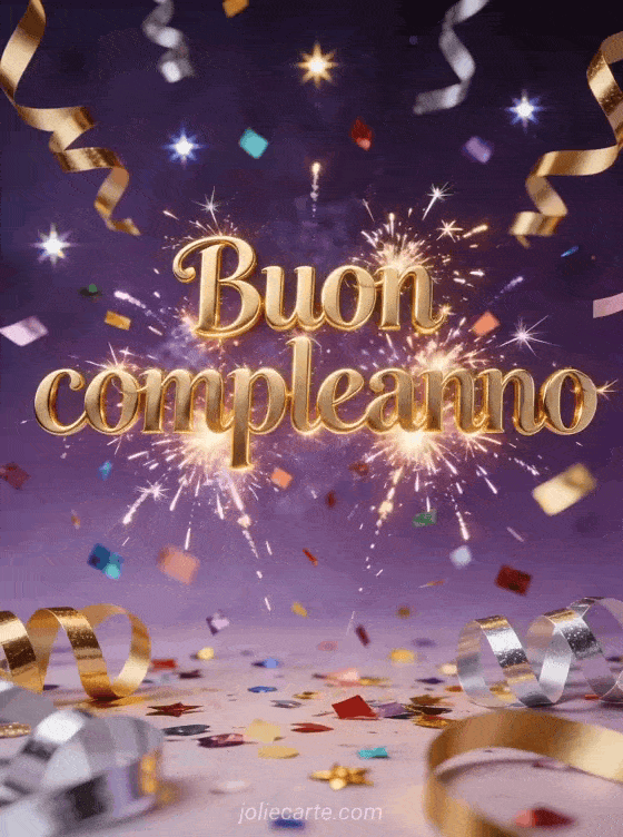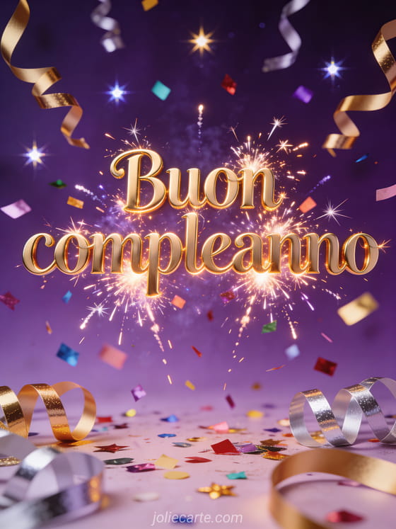 Condividi un biglietto glamour di compleanno con lettere dorate effetto fuochi d'artificio, coriandoli colorati, stelle filanti argento e oro, e stelle luminose su uno sfondo notturno viola profondo. Scopri anche un sms per augurare buon compleanno a mio figlio, un biglietto di compleanno mio figlio o un compleanno figlio.