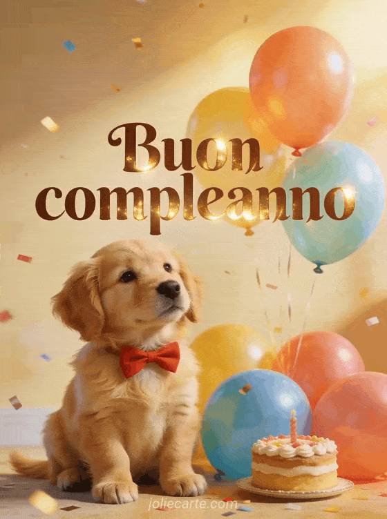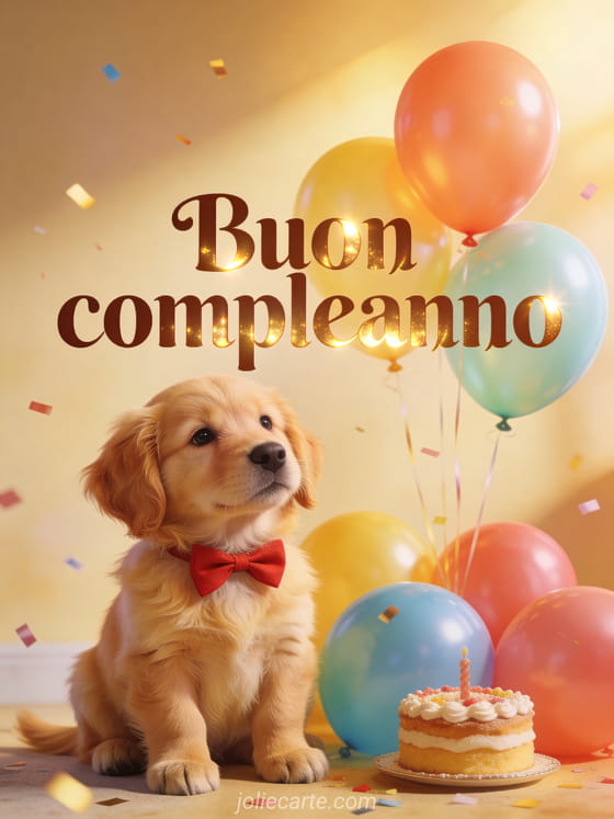 Rallegra il compleanno di qualcuno con questo incantevole biglietto con un adorabile cucciolo di golden retriever con papillon rosso accanto a palloncini colorati e una tortina, calda luce dorata e coriandoli. Scopri anche un biglietto di compleanno con gatto o un biglietto di compleanno con fuochi d'artificio.