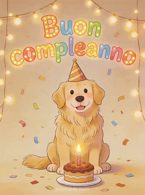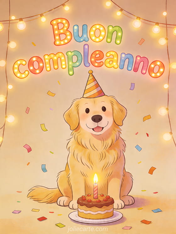 Fai sorridere qualcuno con questo biglietto di compleanno festivo e la sua tenera illustrazione di golden retriever. Scopri anche buon compleanno disegno, buon compleanno principessa o formula per augurare buon compleanno.